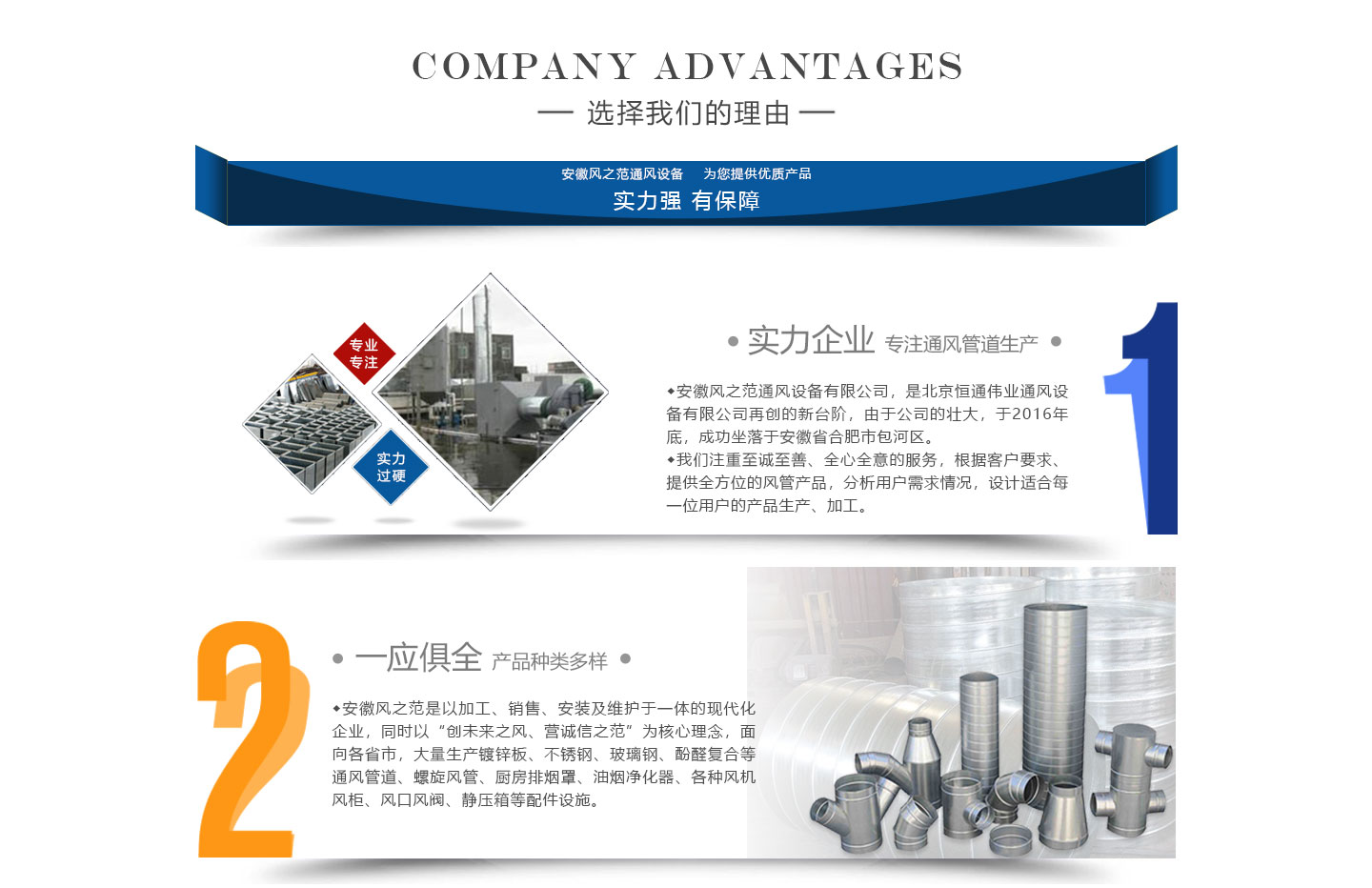 安徽風(fēng)之范通風(fēng)設(shè)備有限公司,是北京恒通偉業(yè)通風(fēng)設(shè)備有限公司再創(chuàng)的新臺階,多年來,公司員工憑著“誠信敬業(yè)、團結(jié)拼搏、勇于開拓、務(wù)實進取”的企業(yè)精神,先后承接了多項重點工程項目,使公司健康穩(wěn)步發(fā)展?,F(xiàn)由于公司的壯大,業(yè)務(wù)的拓展,又于2016年底,成功坐落于安徽省合肥市包河區(qū)。本公司生產(chǎn)設(shè)備精良,技術(shù)力量雄厚,質(zhì)保體系完善!讓用戶體驗到,貼心的服務(wù),無憂的售后!風(fēng)之范是以加工、銷售、安裝及維護于一體的現(xiàn)代化企業(yè),同時以“創(chuàng)未來之風(fēng)、營誠信之范”為核心理念,面向全國各省市,大量生產(chǎn)鍍鋅板、不銹鋼、玻璃鋼、酚醛復(fù)合等通風(fēng)管道、螺旋風(fēng)管、廚房排煙罩、油煙凈化器、各種風(fēng)機風(fēng)柜、風(fēng)口風(fēng)閥、靜壓箱等配件設(shè)施。廣泛承接商場、工廠、酒店、寫字樓、地下室等,消防排煙工程、除塵凈化工程、室內(nèi)通風(fēng)工程、暖通空調(diào)工程、廚房排煙凈化工程。我們力求上進,追求,歡迎各界人士技術(shù)指導(dǎo),經(jīng)濟合作,共創(chuàng)美好明天!